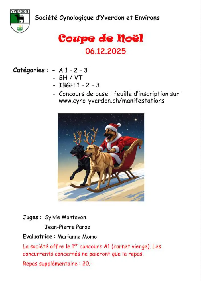 Ce samedi 6 décembre 2025, la Société Cynologique d’Yverdon et Environs accueillait sa traditionnelle Coupe de Noël sur les terrains de la Cabane et des Vuagères, au cœur d’Yverdon-les-Bains.